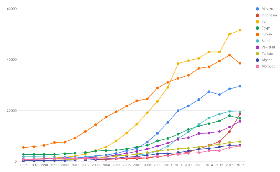 The scientific output of Muslim-majority countries has grown tremendously over the past 20 years, measured in the number of scientific and scholarly papers published in international journals. The top scientific publisher is Iran, followed by Turkey, followed by Malaysia: