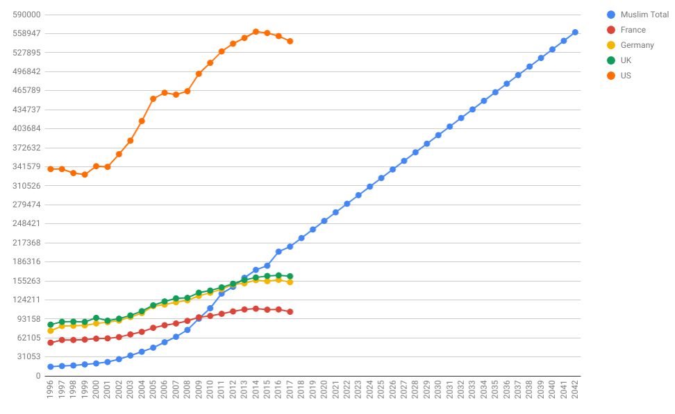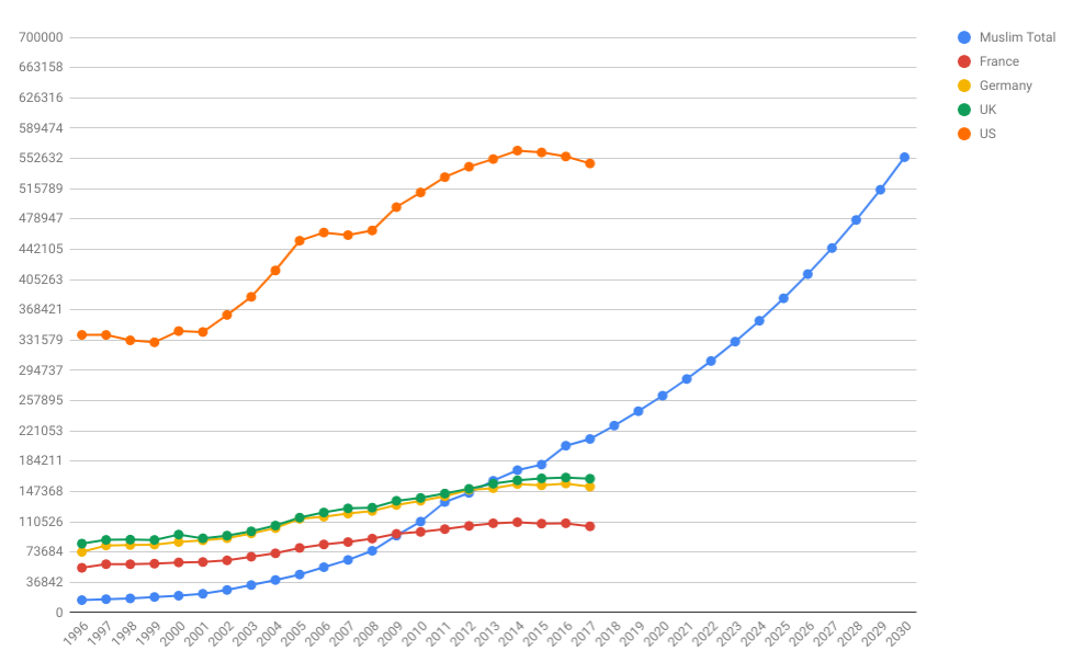 Below is a comparison of the Muslim total (blue) with the established scientific powers France, Germany, the United Kingdom and the United States:
