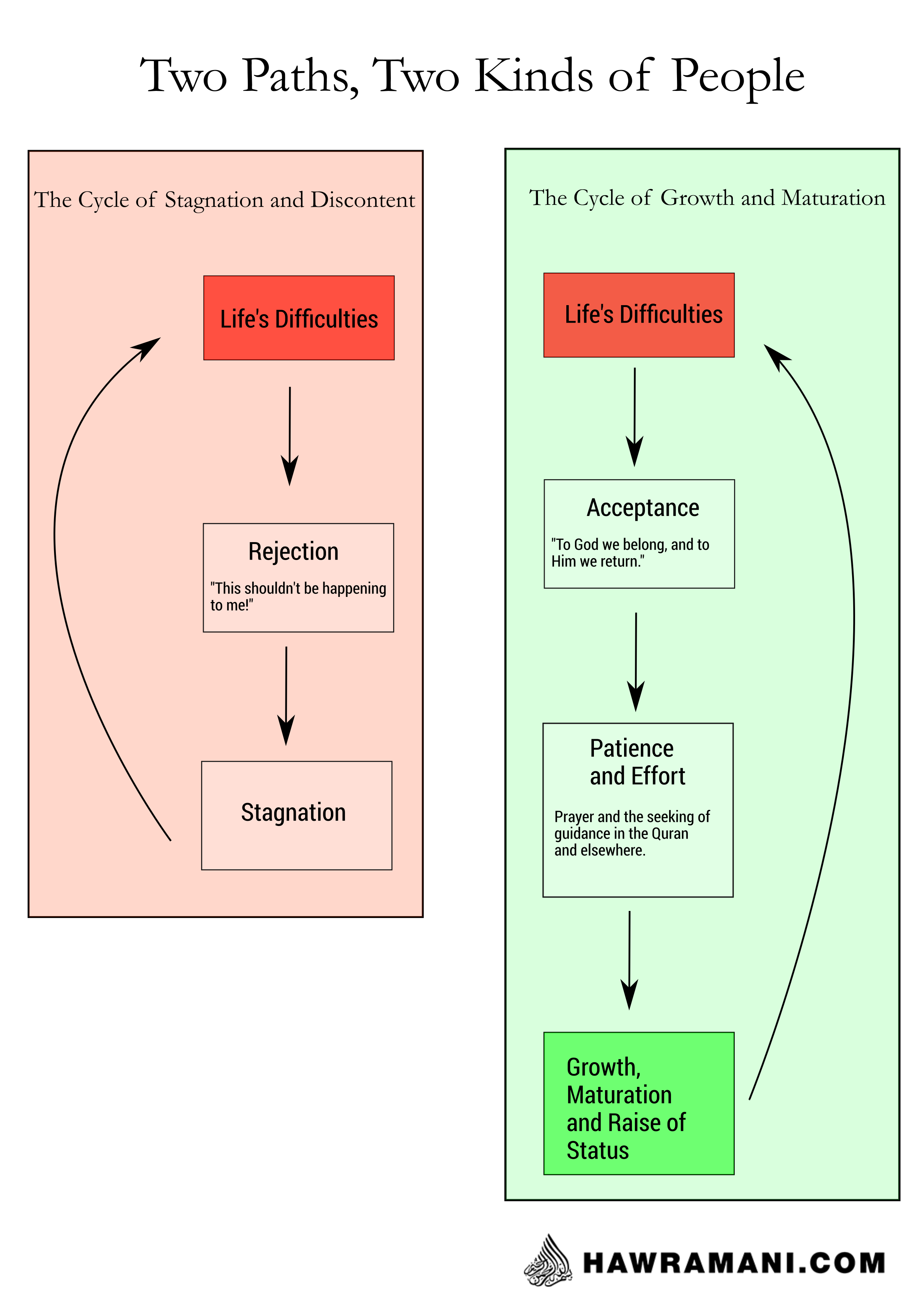 If you are tested, instead of thinking “This shouldn’t be happening to me!”, consider it an opportunity to practice patience and a call to improve yourself. We never grow if we constantly turn our backs on our problems. Growth happens when we accept that this is exactly what we should be going through, this is God’s decree for us. If God wants, He can remove our difficulty in an instant. If we feel impatient and discontented, this is a clear sign that we are not close enough to God, that we are rejecting Him. We are, in effect, telling Him “We dislike this thing that You are doing to us O God and reject Your decree for us, we know better than You what should be happening to us, and this is not it.” You will meet many religious people who are stuck in this way of thinking. Their life’s difficulties, failures and missed opportunities are present in their minds and they blame God for not providing them with a better lot.