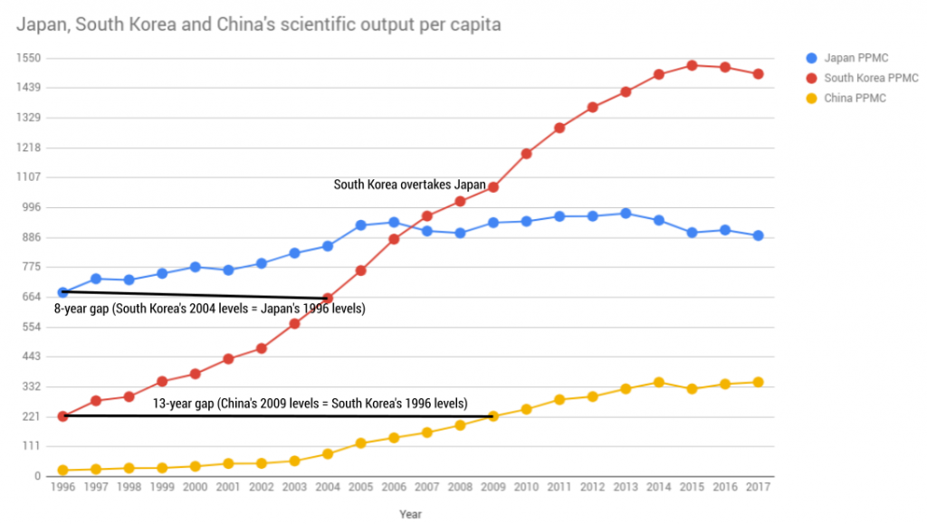 In fact, the correct assumption is that its economic growth will be quite lower. But what we are modeling here is not economic growth, it is growth in scientific output, whose future growth follows along the lines of a country’s past economic growth.
